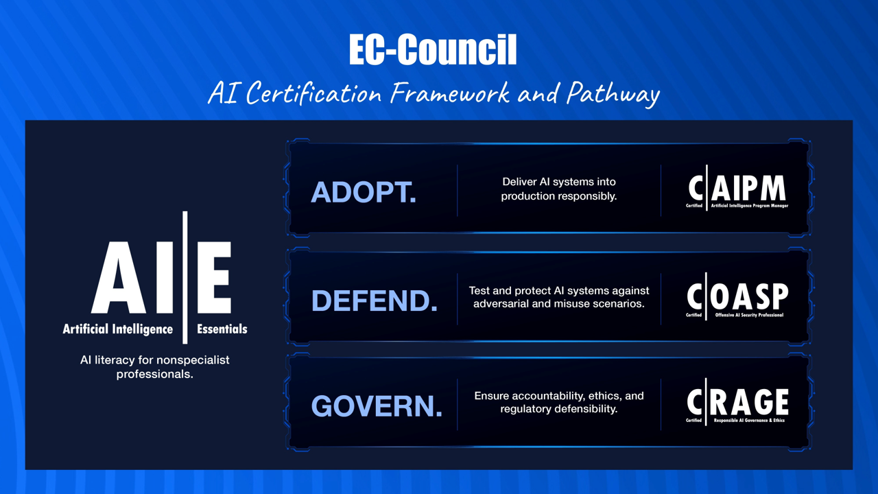 Through our partnership with EC-Council, Blue Summit delivers a complete AI certification pathway—equipping professionals to adopt, secure, and govern AI across the enterprise.